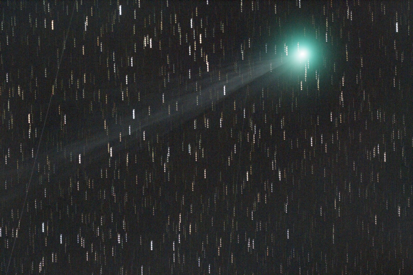 The 17 pictures have been aligned to the comets center. Therefore, the stars appear as broken lines. Die 17 Bilder wurden auf den Kometenkopf justiert, deshalb erscheinen die Sterne als unterbrochene Striche. |